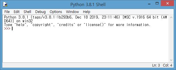 그러면 다음과 같이 파이썬 프로그램을 사용할 수 있는 파이썬 Shell창이 나타난다. 파이썬 프로프트 >>>에 커서가 깜빡이는 것을 볼 수 있다.