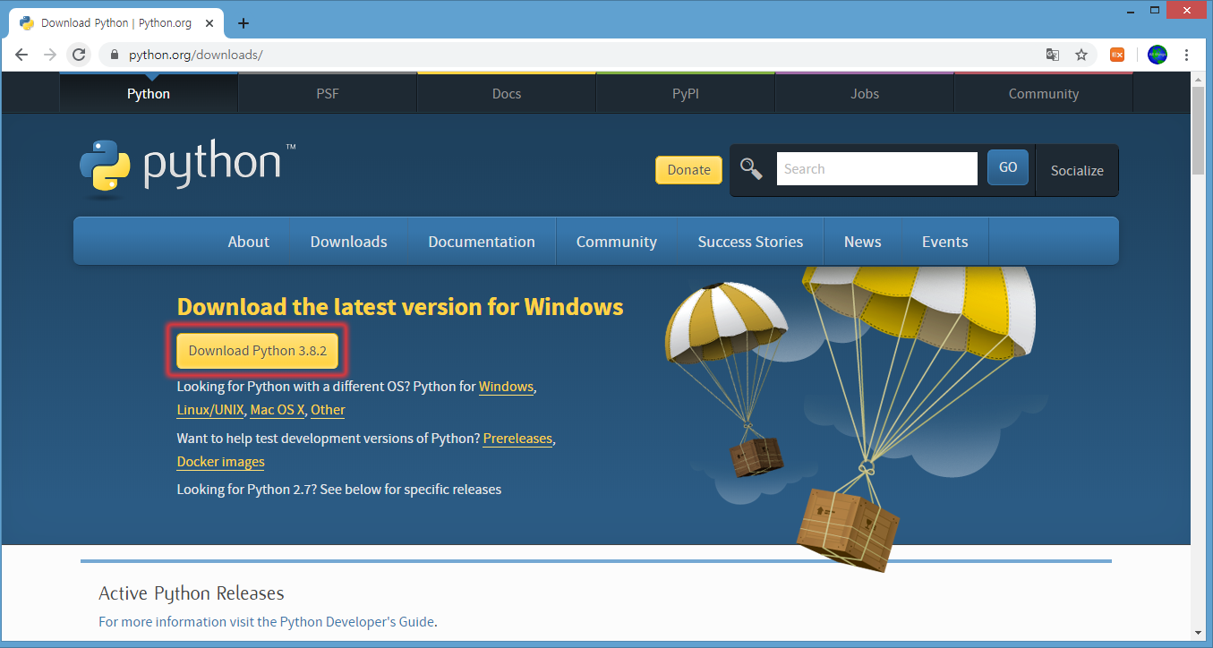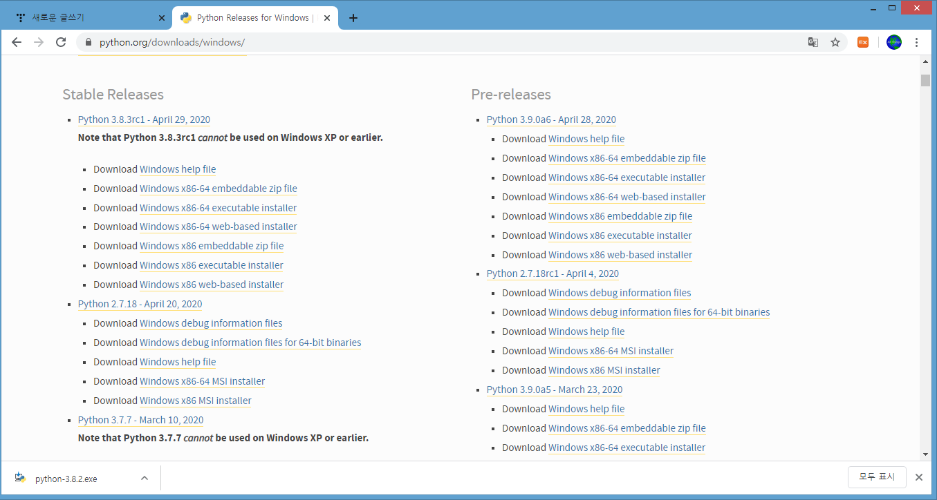Downloads 페이지에서 최신 버전의 파이썬을 다운받는다.