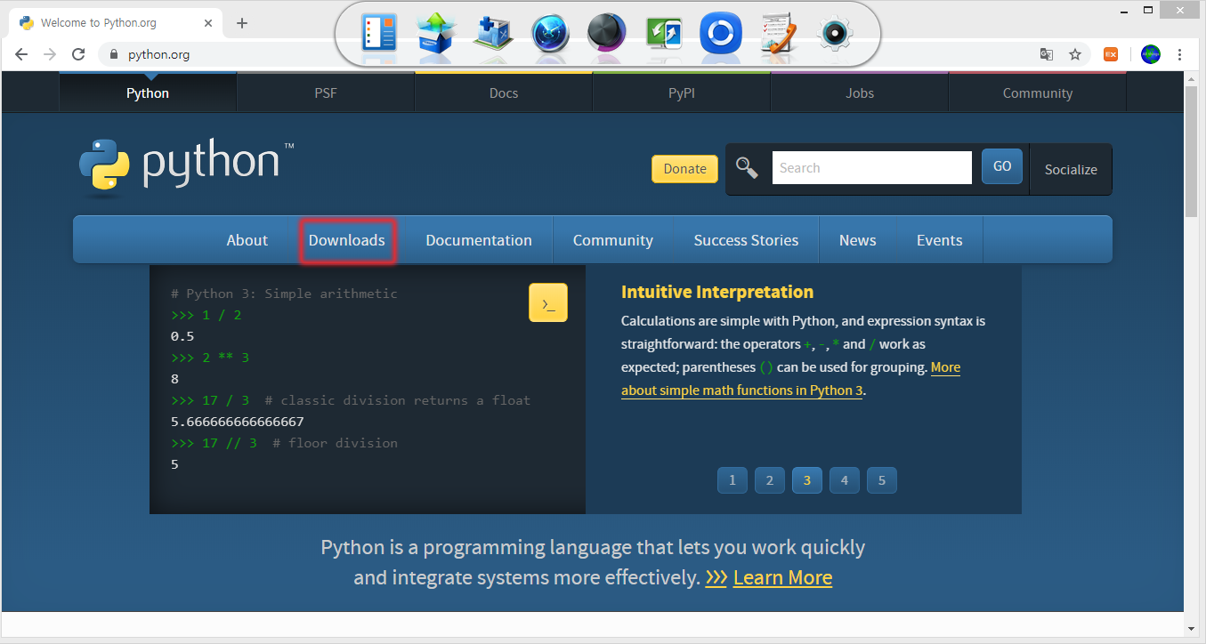 접속한 파이썬 사이트에서 Downloads라는 메뉴를 클릭한다.