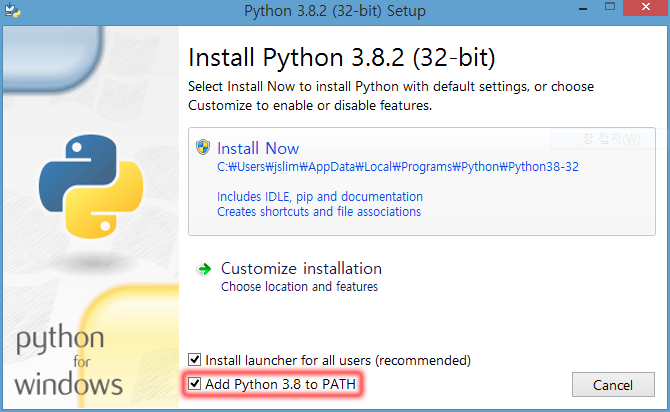 파이썬 설치 첫번째 화면에서 가장 아래쪽에 있는 Add Python 3.8 to PATH를 클릭하여 체크한다. 이것을 체크해서 파이썬을 설치하면 어떤 폴더(디렉토리)에서도 파이썬을 실행할 수 있고 추가 패키지도 설치할 수 있다.