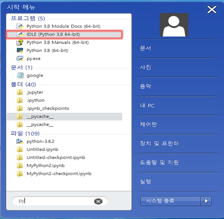 파이썬을 설치해도 바탕화면에 아이콘이 설치되지 않으므로 파이썬을 사용하기 위해 시작>모든 프로그램>Python 3.8>IDLE(Python 3.8 64-bit)를 찾아 클릭한다.