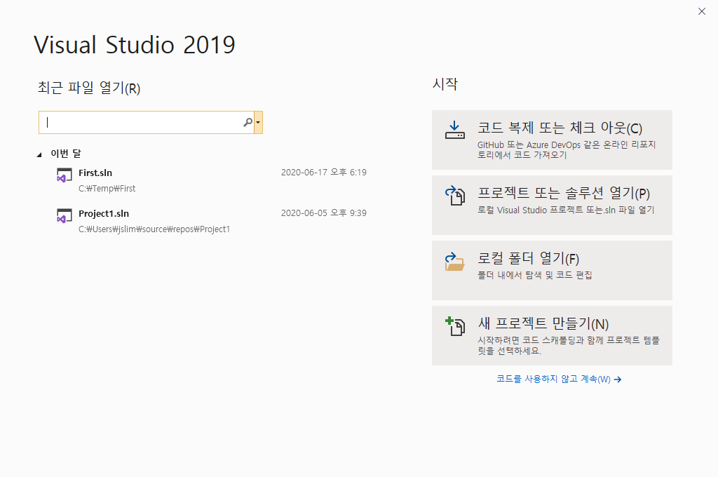 Visual Studio 2019를 실행하면 "최근 파일 열기(R)" 부분에 표시된 리스트에서 찾아 선택한다.