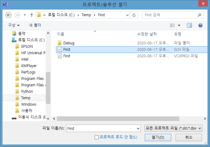 만약 그곳에 없으면 "시작" 부분에서 "프로젝트 또는 솔루션 열기(P)"를 클릭한 후 [프로젝트/솔루션 열기] 창에서 파일이 있는 프로젝트 폴더를 선택하고 그 폴더 안에서 *.sln 파일을 찾아 선택한 후 [열기] 버튼을 클릭한다.