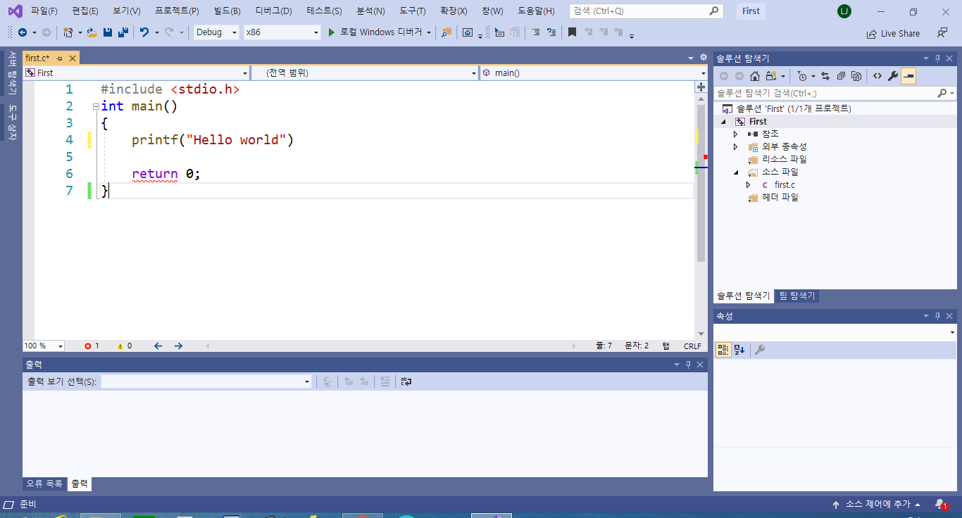 First 프로젝트의 first.c 파일의 6라인에서 오류가 발생했고 오류는 구문 오류로 ;이(가) return 앞에 없다는 내용이다. 그러면 오류를 수정하기 위해 6라인 앞에 있는 4라인 끝에 세미콜론을 입력하면 된다. 만약 소스 코드의 길이가 길어 오류가 난 라인을 찾기 어려우면 오류 메시지 부분을 더블클릭하면 오류가 발생한 부분의 소스 코드가 표시되고 오류 라인에 커서가 나타난다.